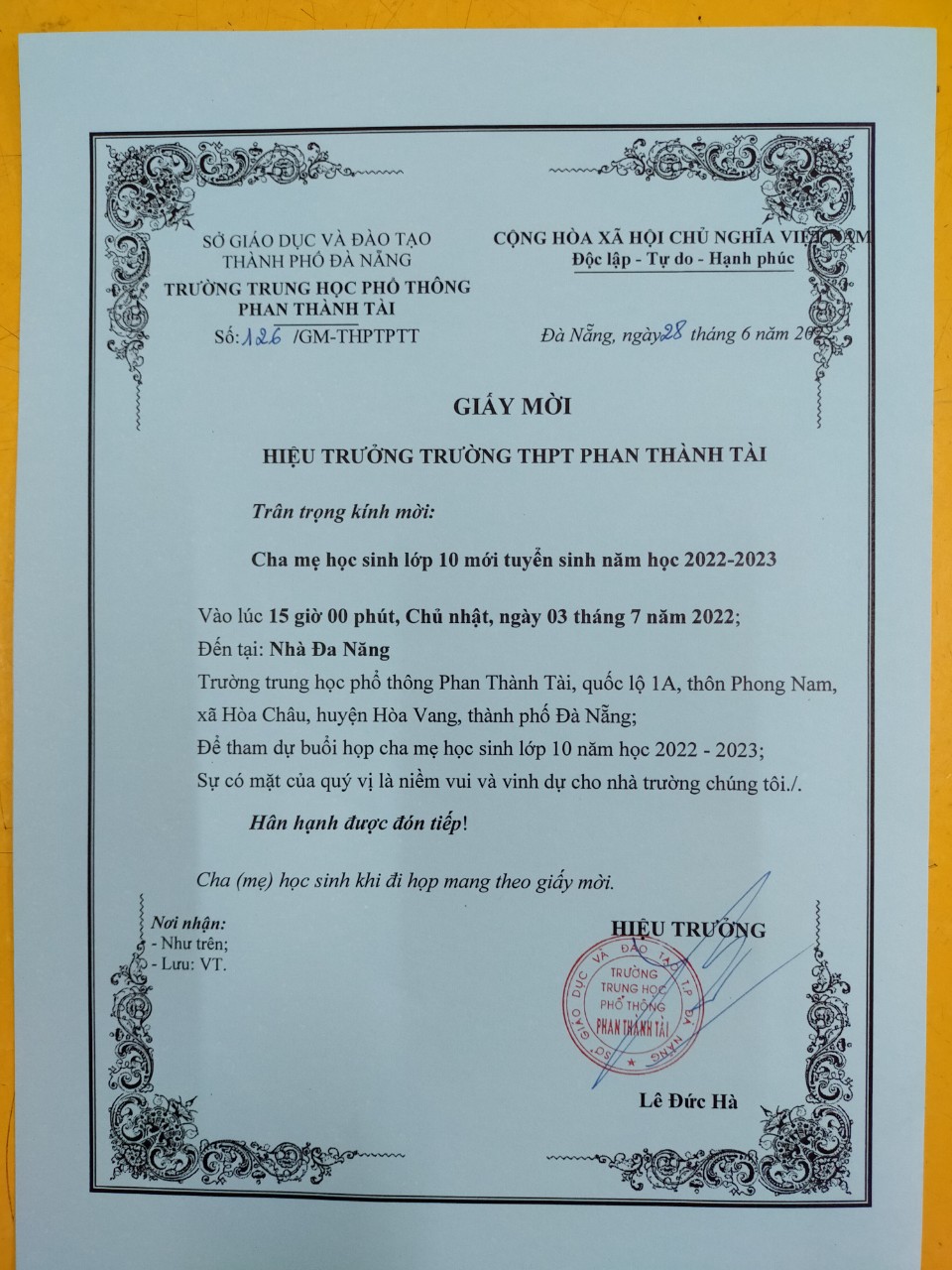 Phụ huynh xem và tham gia đầy đủ Điều hướng bài viết Giấy mời gặp mặt cựu học sinh trường THPT Phan Thành tài để chuẩn bị tổ chức kỉ niệm 20 năm thành lập trường Thông báo thu hồ sơ tuyển sinh lớp 10 năm học 2022-2023